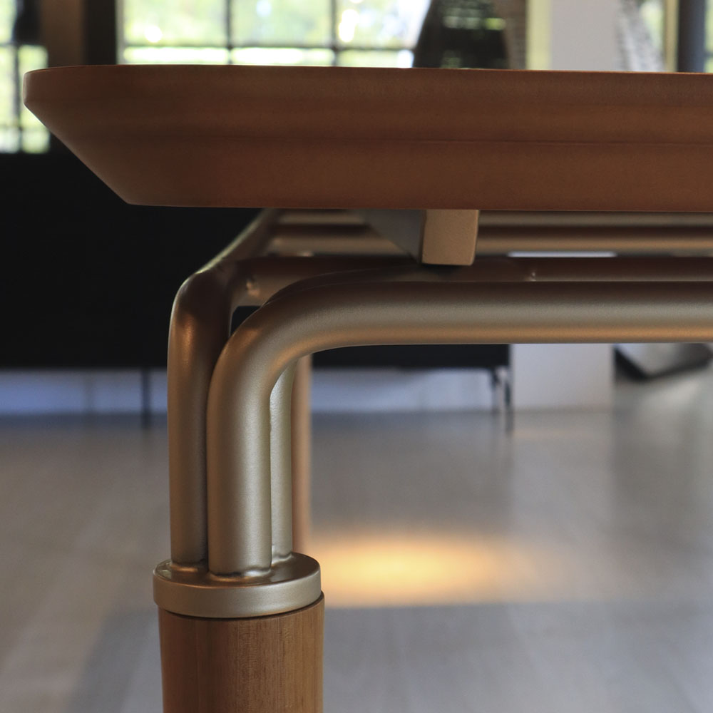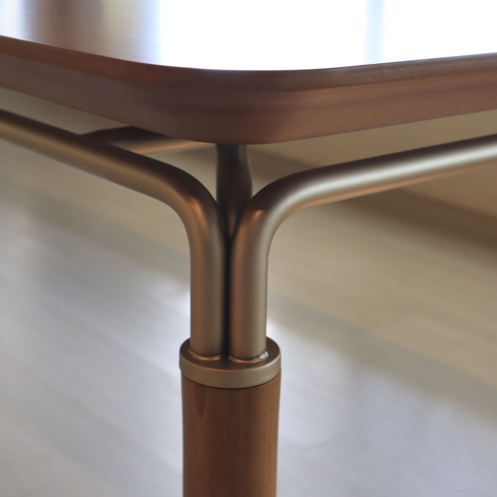 A Mesa de Jantar 160cm Arcos é desenvolvida em MDF revestido em lâmina ou laqueado. Base em aço carbono, pintura líquida com fundo anticorrosivo e pés revestidos em madeira.