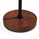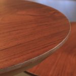 As mesas laterais Elli são construídas em MDF laminado (tampo e base) com lâminas de madeira natural, sendo de Jatobá. A haste central é em alumínio pintado, proporcionando mais leveza e durabilidade ao produto.
