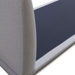 Disponível em tecidos exclusivos de alto padrão e em medidas para diversos tamanhos de espaços (solteiro 0,95 m), esta cama é estruturada em madeira de reflorestamento de Eucalipto Saligna.
