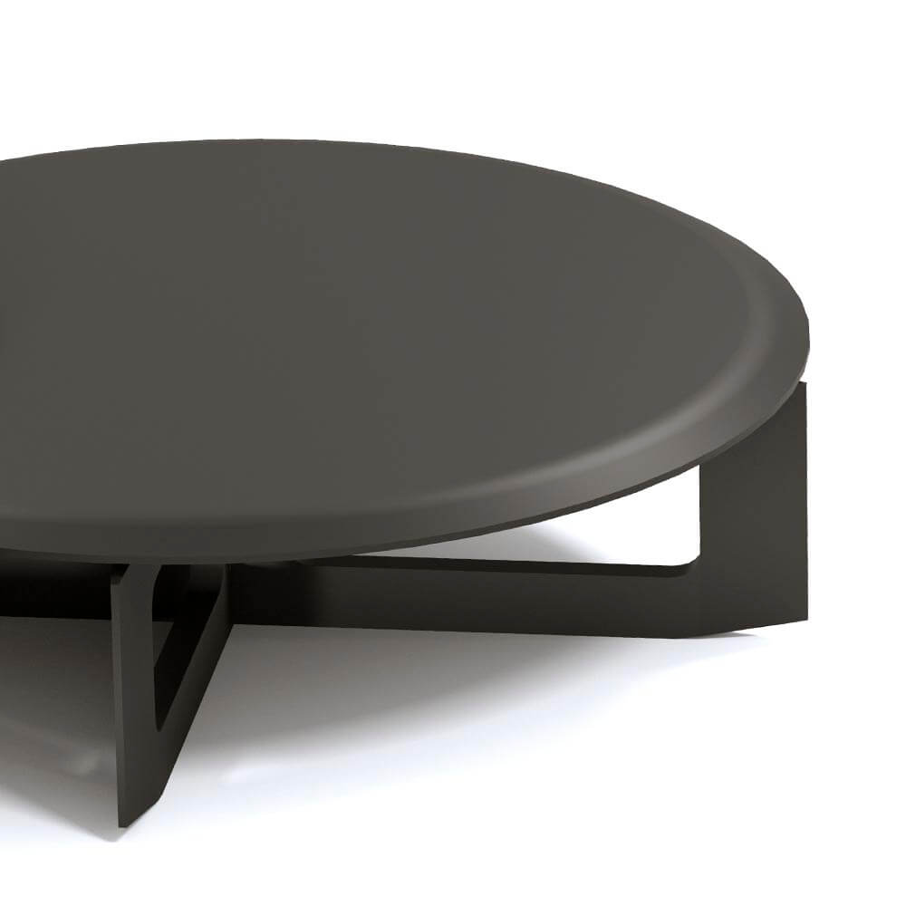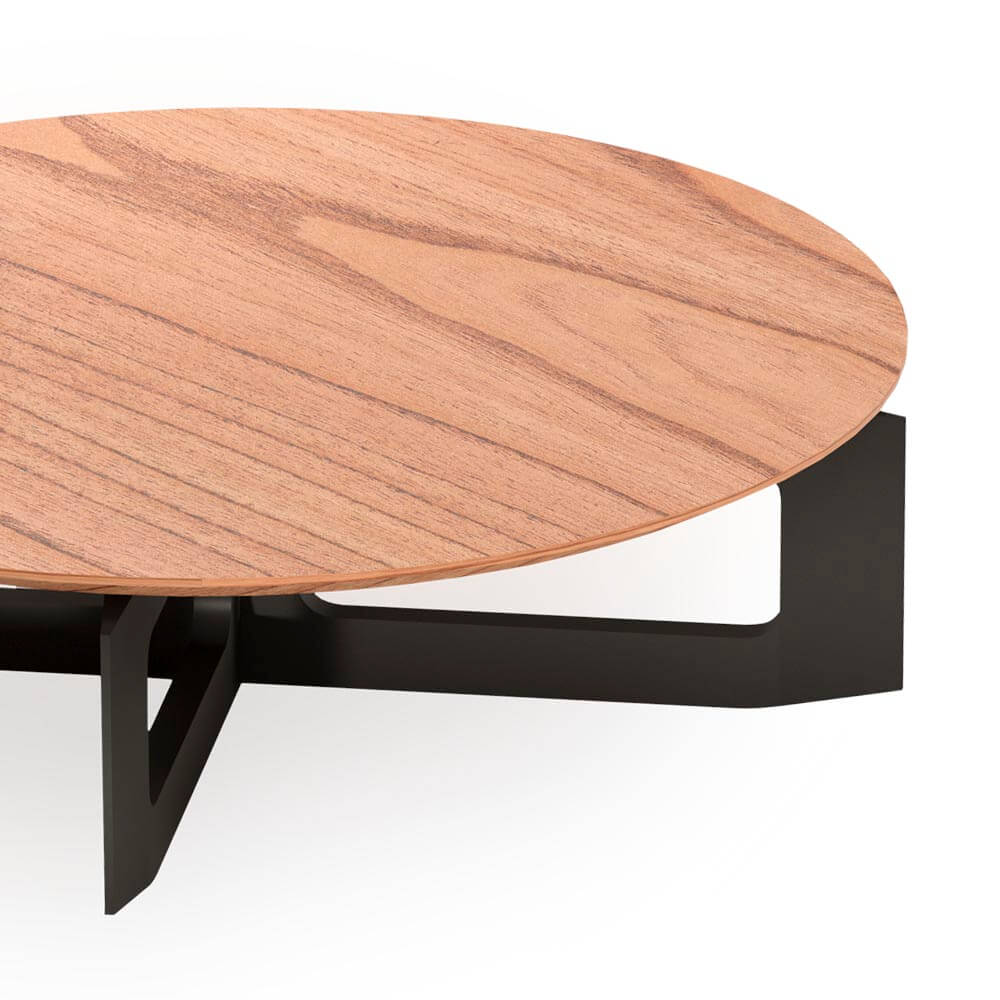 A mesa de centro Tri é construída com tampo de MDF e lâmina natural de madeira ou Laca, pés em alumínio com pintura epóxi que oferecem durabilidade e estilo.