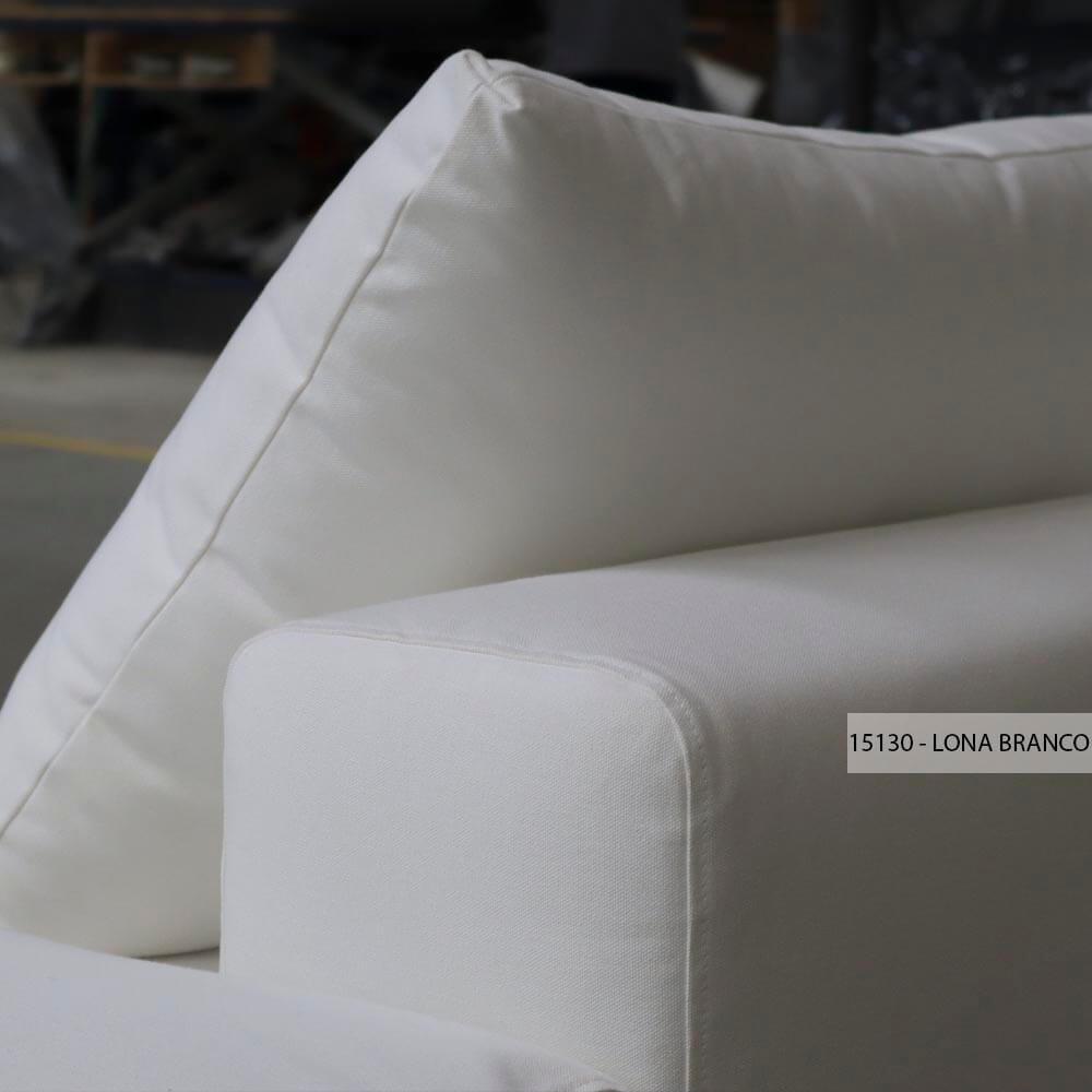 Encosto com almofadas feitas com forro colméia de TNT preenchido com microfibra de poliéster siliconada, assento com espuma de poliuretano D28.